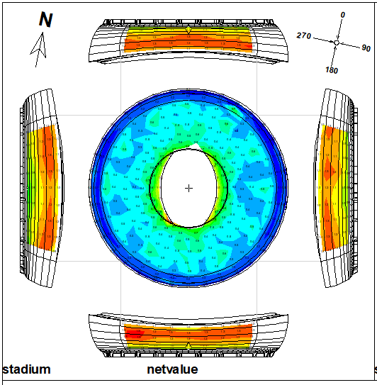 盧賽爾城當地3s陣風基本風速為38m/s,風工程團隊在風洞中制作了1:250的模型,按照ASCE/SEI7-16和ASCE/SEI49-12的要求進行了風洞試驗和相關數據處理,給出了36個風向下風壓系數分布以及50年重現期下極值壓力的統計值。根據風洞試驗數據,對盧塞爾體育場的風振響應進行了分析,并提供了50年一遇的等效靜風荷載。夏馬風是中亞及波斯灣一帶一種強烈的西北風,通常會產生大型沙塵暴。夏馬風可能會將地面沙塵卷入空中并在體育場屋面發生沉積。風工程團隊使用CFD軟件對盧塞爾體育場周圍的風沙運動進行了全尺度數值模擬,獲得了屋面上的積沙分布情況。