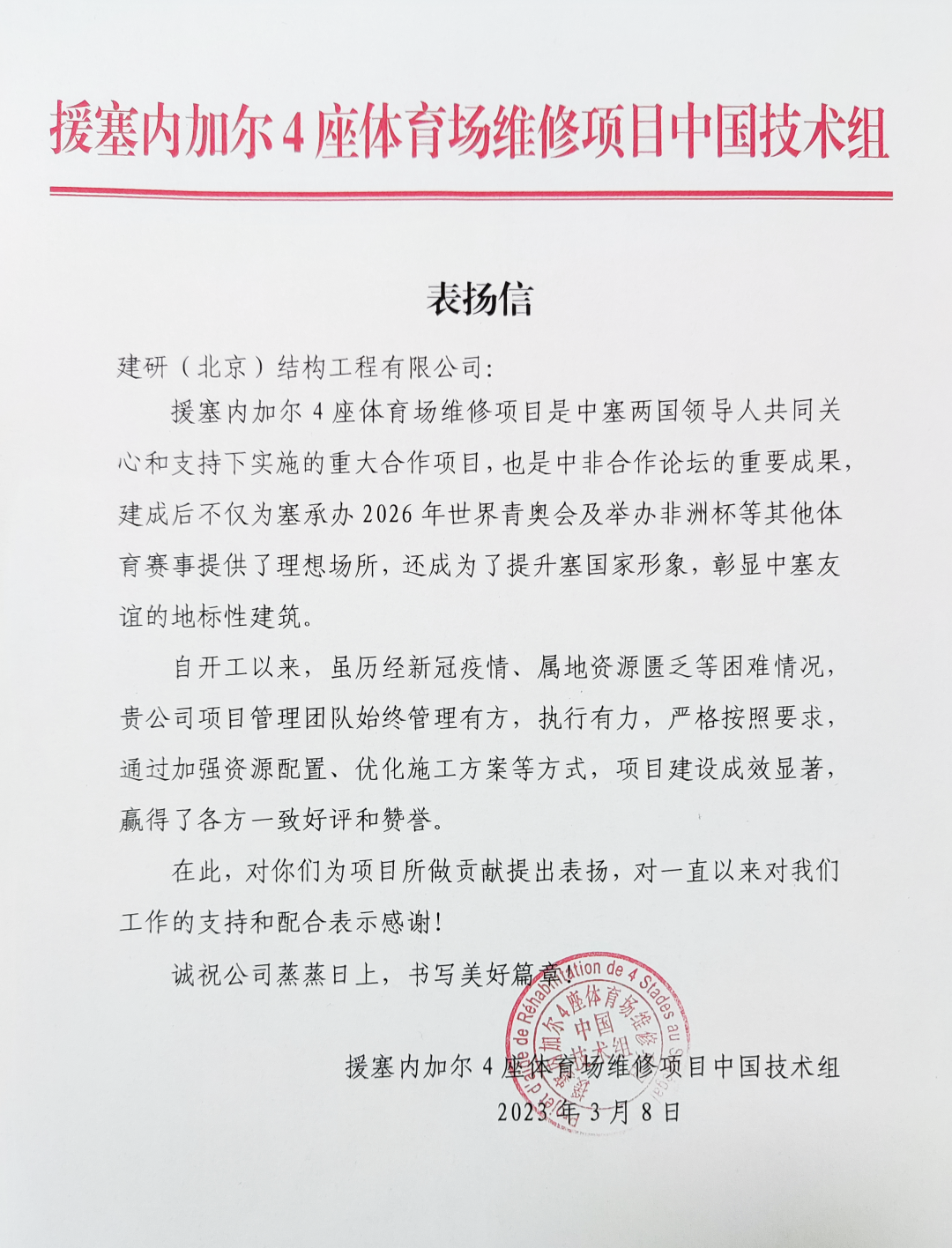 近日,援塞內(nèi)加爾4座體育場維修項目中國技術(shù)組向中建研科技所屬建研(北京)結(jié)構(gòu)工程有限公司(以下簡稱結(jié)構(gòu)公司)發(fā)來表揚信,充分肯定和表揚了結(jié)構(gòu)公司項目管理團(tuán)隊在該項目中作出的重要貢獻(xiàn)。