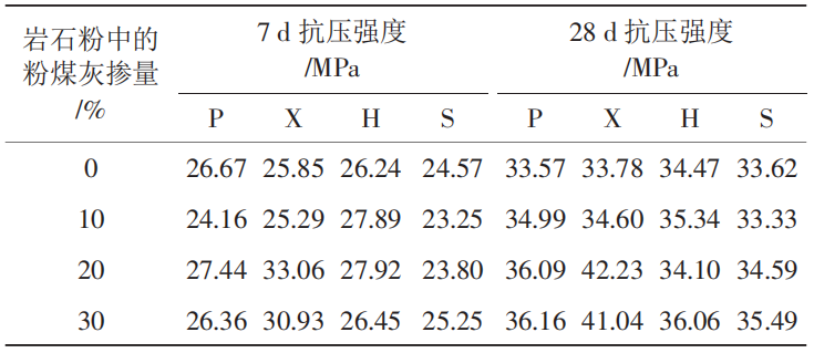 由上表可知,片麻巖石粉水泥膠砂的 7 d 抗壓強(qiáng)度在20%粉煤灰摻量下略有提高,其它摻量下有所下降,28 d 抗壓強(qiáng)度隨著粉煤灰摻量的增加而提高;粉煤灰對(duì)玄武巖石粉水泥膠砂 7 d 和 28 d 的抗壓強(qiáng)度影響規(guī)律相似,均在粉煤灰20%摻量時(shí)達(dá)到最大;摻粉煤灰對(duì)花崗巖石粉和石灰石粉水泥膠砂 7 d 和 28 d 的抗壓強(qiáng)度影響較小,粉煤灰摻量改變,抗壓強(qiáng)度變化范圍在 2 MPa 以內(nèi),敏感性較差。