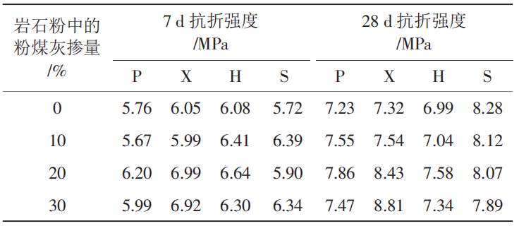 表2:不同巖石粉與粉煤灰復(fù)合對(duì)膠砂抗折強(qiáng)度的影響
