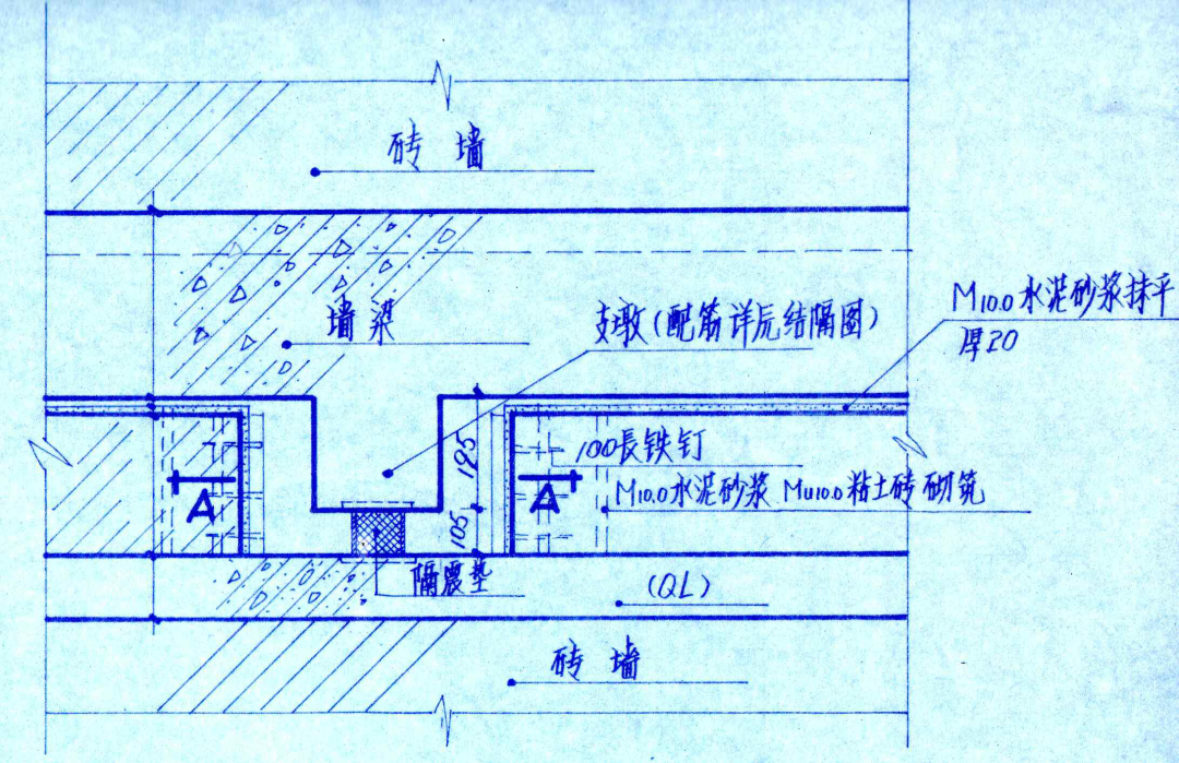 • ?隔震縫沿豎向300mm,上部為上墻梁,下部為磚墻頂部圈梁或鋼筋混凝土墻頂。
