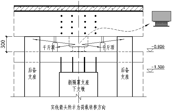 新支座上、下支墩混凝土達到設計強度,緩慢移除千斤頂。由千斤頂及后備支座共同承擔的荷載轉移至由新隔震支座及后備支座共同承擔。