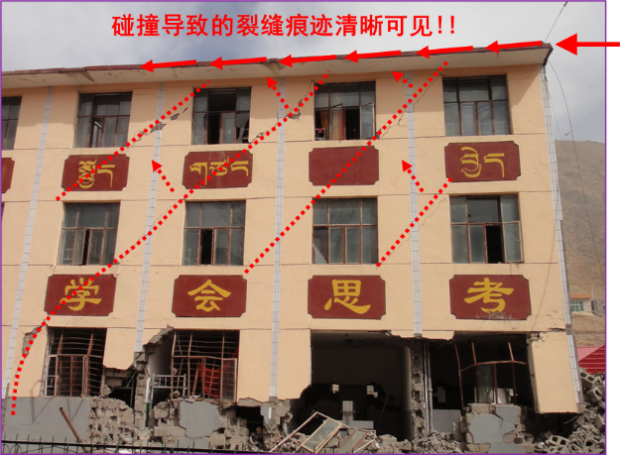 (b)女生公寓樓,地震中,防震縫兩側的結構單體相互碰撞,東側結構完全倒塌,西側結構的碰撞產生的斜裂縫清晰可見。
