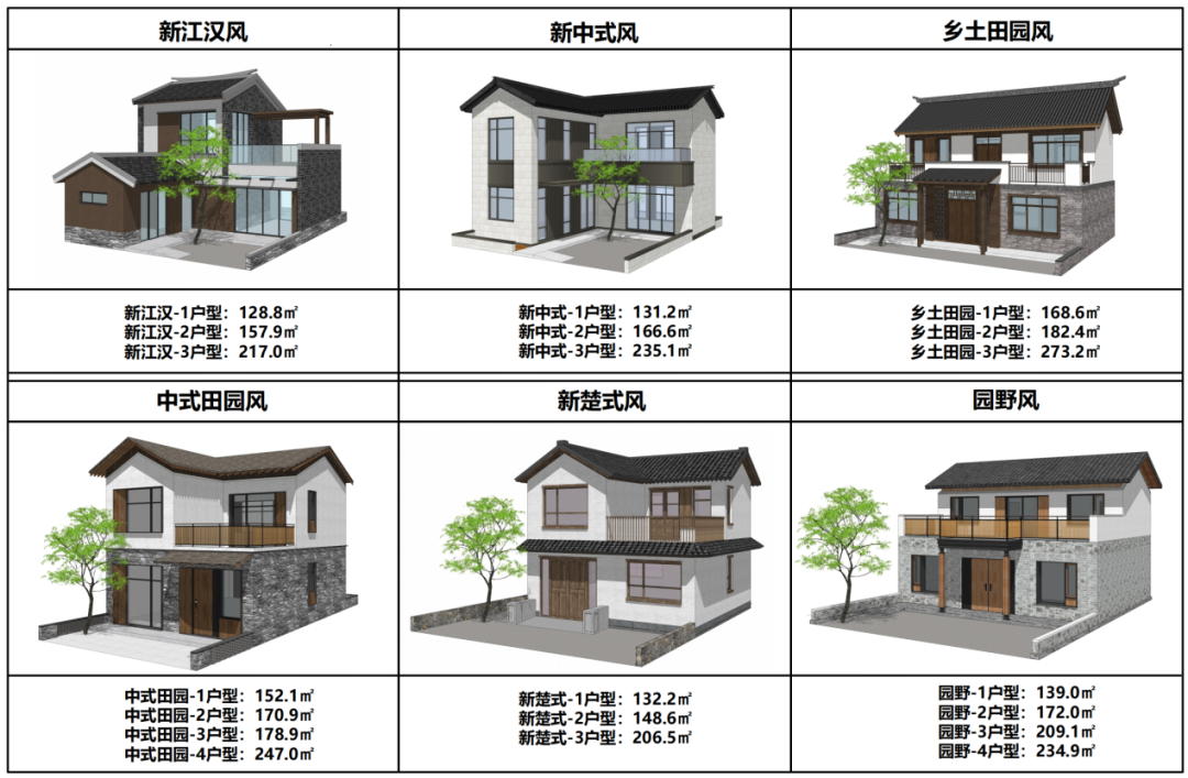 按照“功能現(xiàn)代、結(jié)構(gòu)安全、成本經(jīng)濟(jì)、綠色環(huán)保、與鄉(xiāng)村環(huán)境相協(xié)調(diào)的宜居住房”的總體目標(biāo),在試點(diǎn)示范建設(shè)中,根據(jù)其他不同村灣的特點(diǎn),和未來閑置農(nóng)房改造民宿的需求,設(shè)計(jì)了另外五種不同的建筑風(fēng)貌,形成《湖北省大冶市現(xiàn)代宜居農(nóng)房戶型圖集》。