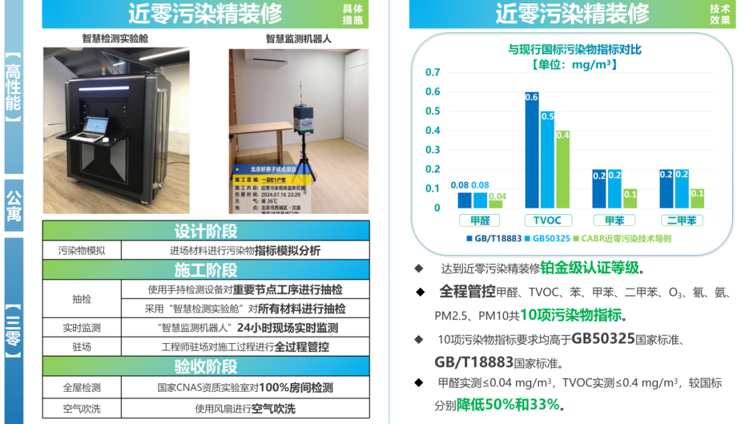 在近零污染精裝修方面,項(xiàng)目開發(fā)貫徹精裝修過程全生命周期的解決方案,在設(shè)計(jì)、施工、運(yùn)營階段對室內(nèi)污染物進(jìn)行模擬計(jì)算、現(xiàn)場管控和持續(xù)監(jiān)測。以中國建研院近零污染精裝修技術(shù)導(dǎo)則為標(biāo)準(zhǔn),通過模擬分析裝修材料中甲醛、TVOC等污染物揮發(fā)情況選材,在工程現(xiàn)場放置空氣檢測艙檢測及抽檢進(jìn)場材料,使用智慧監(jiān)測機(jī)器人進(jìn)行指標(biāo)監(jiān)測,全屋檢測驗(yàn)收確保室內(nèi)空氣性能指標(biāo)符合要求,實(shí)現(xiàn)交付即入住,為住戶提供高品質(zhì)室內(nèi)空氣質(zhì)量。