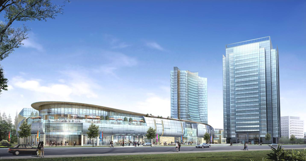 項目周邊有較多的綠化和水體,設(shè)計的宗旨是如何引入自然因素,將其和綜合體室內(nèi)外空間結(jié)合在在一起。高層塔樓布置在南邊,一方面解決了日照陰影的問題,更重要的是在西南的交通樞紐處建立地標(biāo)建筑,辦公樓設(shè)置在西南為一單棟建筑,這樣有利于提升該辦公樓的形象,和運營上的靈活性。弧線外形的酒店設(shè)置在遠(yuǎn)離主干道一側(cè)有利于提供更私密和單獨出入囗,而提高標(biāo)淮和檔次。商業(yè)裙房部份在西側(cè)為弧線設(shè)計,一方面和自然水體環(huán)境相呼應(yīng),另一方面拉長了商業(yè)部份的立面,而帶來更多的商業(yè)曝光面,在商業(yè)裙房的東側(cè)為四季中庭,該設(shè)計的目的是提供一個有獨特建筑語言的文化,餐飲環(huán)境,一個似乎室外具有充足采光而又兼有人工調(diào)控和適用于任何氣候條件下的場所。
