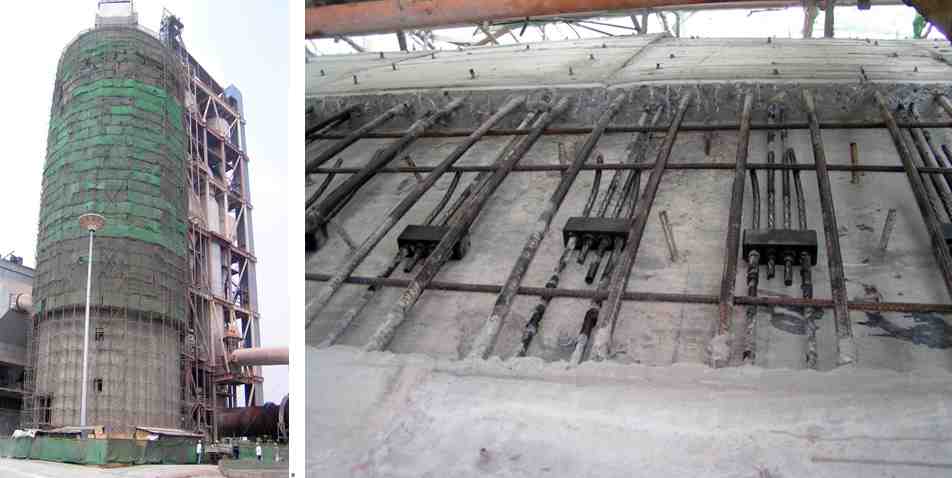 筒倉高58m,外徑23m,壁厚380mm,采用環(huán)向配置預(yù)應(yīng)力筋,環(huán)、豎向配置單層鋼筋網(wǎng)的混凝土疊合層法進(jìn)行加固。