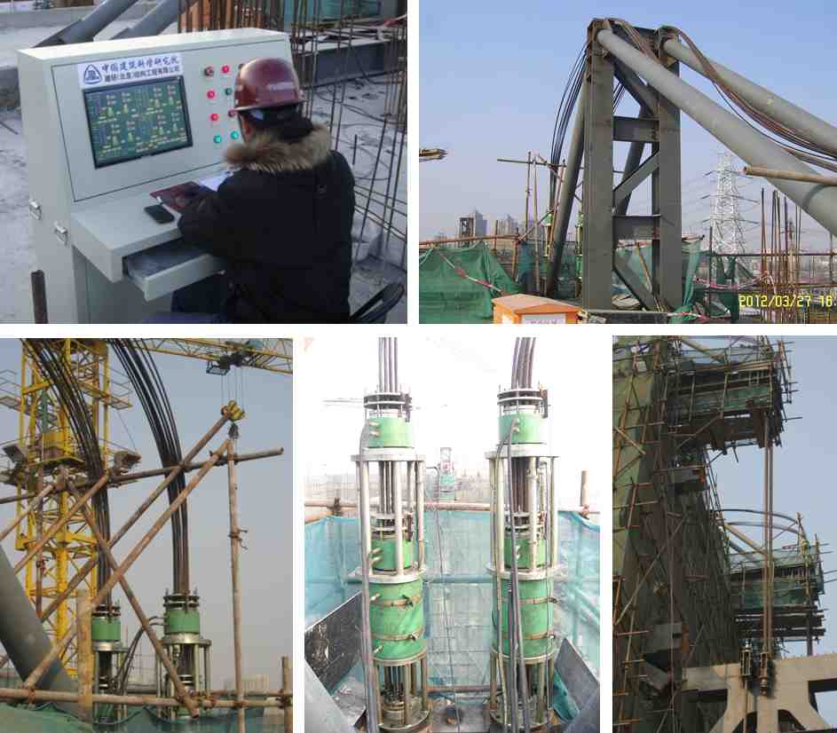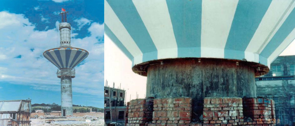 河北承德地區(qū)鋼鐵水泥廠擴(kuò)建的150m3高爐配套工程,容量500m3,高32m的倒錐形水塔是當(dāng)時國內(nèi)此類水塔中最高最大的水塔。塔柱直徑4m,采用了滑模施工;錐形水柜在地面預(yù)制。水柜的重量大,提升及安裝工作是本工程施工的關(guān)鍵。該工程采用以鋼絞線為吊索的液壓自動提升裝置進(jìn)行水柜的提升,成功地完成了300t重的倒錐形水柜的提升和安裝工作,其水平安裝精度達(dá)到了驗(yàn)收標(biāo)準(zhǔn)。此法吊裝,具有提升速度快、作可靠、便于調(diào)整、減輕工人勞動強(qiáng)度等,是當(dāng)時國內(nèi)首次應(yīng)用的新工藝新技術(shù)。