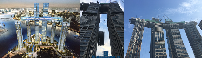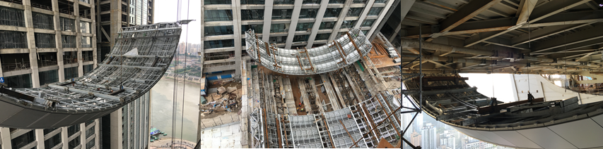 超輕弧形鋁板幕墻系統(tǒng)提升。具有提升高度高(190m)、帶維護(hù)結(jié)構(gòu)重量極輕對風(fēng)極度敏感、周邊邊界復(fù)雜、局部提升后仍需滑移就位等特點(diǎn)。采用“豎向張緊拉索+水平纜風(fēng)”作為提升抗側(cè)體系,部分靠近塔樓側(cè)幕墻單元采用“提升+高空滑移就位”的安裝方案實(shí)現(xiàn)幕墻系統(tǒng)的高效安裝。