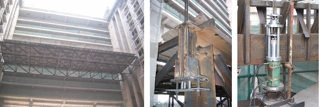 北京科技大學(xué)鋼結(jié)構(gòu)連廊共分四層,跨度為25.2m。現(xiàn)場若采用高空拼裝,則需搭設(shè)近80m高的腳手架,經(jīng)濟(jì)成本過高;因此采用液壓千斤頂整體提升工藝完成連廊鋼結(jié)構(gòu)施工。實(shí)施時,在標(biāo)高12.5m(3層)處將各層連廊鋼結(jié)構(gòu)加工完成,連廊兩端設(shè)置懸臂梁牛腿,之后通過設(shè)置在懸臂牛腿上的千斤頂將連廊鋼結(jié)構(gòu)整體提升就位。