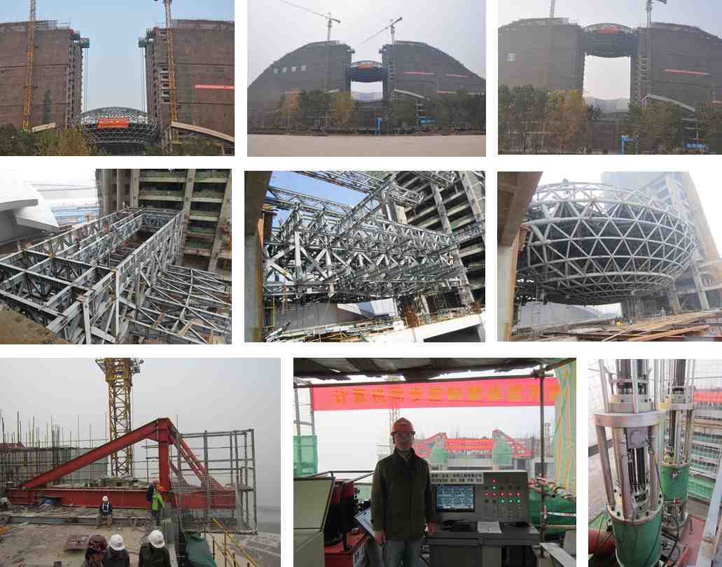 星空會所橢球鋼結(jié)構(gòu)位于武漢國博洲際酒店的頂部18層~20層的中間連體部位,外觀形式為橢圓球,橢圓球內(nèi)部由兩層鋼桁架結(jié)構(gòu)組成,外表為單層空間網(wǎng)格結(jié)構(gòu),結(jié)構(gòu)總重約1350t。結(jié)構(gòu)內(nèi)部高度21.4m,頂部標(biāo)高約97m。由于橢圓球鋼結(jié)構(gòu)為非對稱且節(jié)點(diǎn)復(fù)雜、拼裝場地受限制,同時提升高度大、空中對接難度更大,因此施工難度非常大。為了達(dá)到同步提升對結(jié)構(gòu)平衡和同步控制的要求,本工程采用了我司研發(fā)的基于伺服技術(shù)和PLC控制系統(tǒng)的大型結(jié)構(gòu)整體同步移位系統(tǒng)。